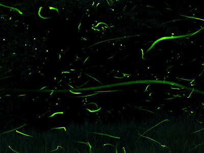 本格的な梅雨の季節となり湿った蒸し暑い空気のなか、夕日が沈んだほの暗い夜の空に、柔らかい幻想的な光を放ちながら、蛍が乱舞しています。日が沈み、涼しい風が一瞬吹くような、風景です。