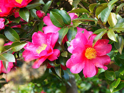 山茶始開はつばきはじめてひらくと読みますが山茶は椿(つばき)ではなく、山茶花(サザンカ)のことを言うそうです。椿と山茶花は、同じツバキ科ツバキ属ですが、花期(椿は12〜4月、山茶花は10〜12月)が違います。落花は、椿が首から落ちるのに対して、山茶花は一枚一枚バラバラに散ります。また山茶花の葉にはぎざぎざが目立ちますが。椿の葉にはぎざぎざがありません。童謡『たきび』にも登場する冬の花が、道端の庭木にポツン、ポツンと咲き始めます。