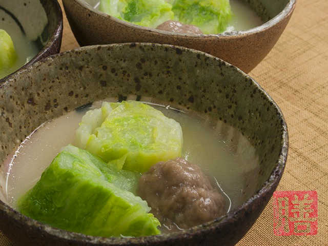2.和牛のつみれを茹でて白菜の下ゆでした汁と出汁半々に白味噌と薄口醤油で味付けします。