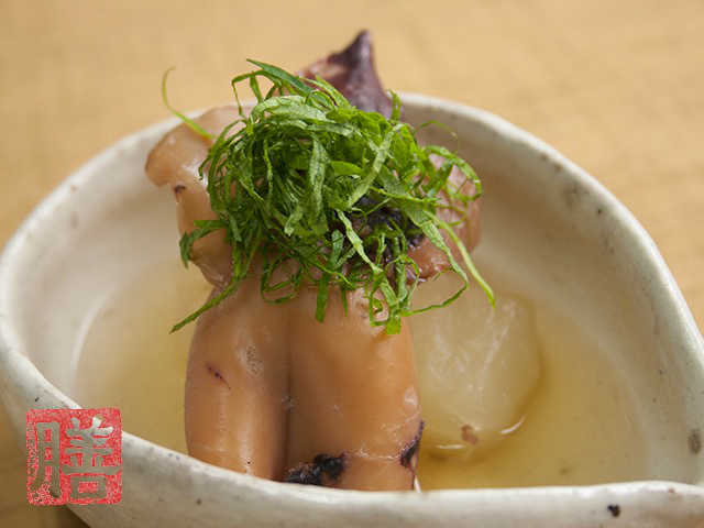 2.出汁を鍋に入れ沸騰してきたら、大根、いかを入れ、出し昆布をいれて強火にし、アクをとります。