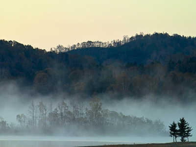 長い冬を過ぎ乾燥していた空気が、春の訪れを告げる温かい雨によって山野の景色が霞みがかって見える、春の風景です。