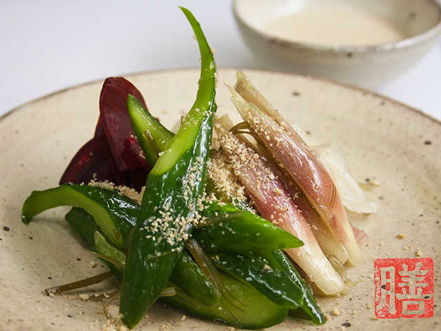 2.胡瓜は大きく長めに、茗荷は縦4等分、かぶは皮付きのまま薄型に、ビーツは