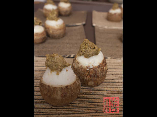 3.きぬかつぎを茹でて、蕗味噌をつけて出来上がり。
