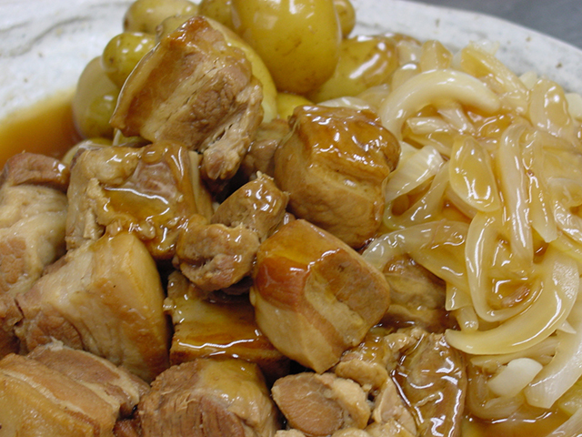 豚肉の肉じゃがは、新ジャガイモ、新たまねぎ、豚肉の組み合わせで、栄養的にも満点の料理。甘辛いしょうゆ味は日本酒との相性も抜群ですので、おつまみとして最高です。