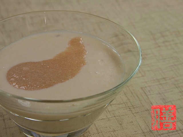 2.豆乳に出汁醤油と塩で味を付けフードプロセッサーで細かくした桃を加えかき混ぜます。