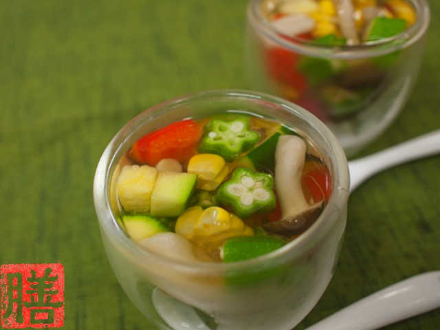 2.出汁をとり、味付けをし下茹でをした野菜を入れ軽く煮て粗熱をとって冷蔵庫で冷やす。