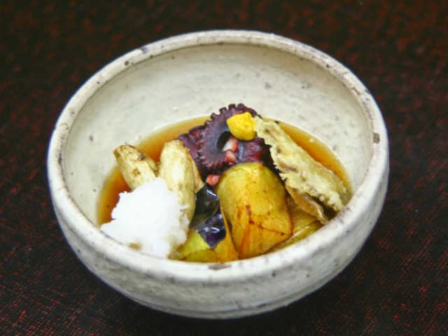 蛸の柔らか煮、新牛蒡,水茄子の盛り合わせ